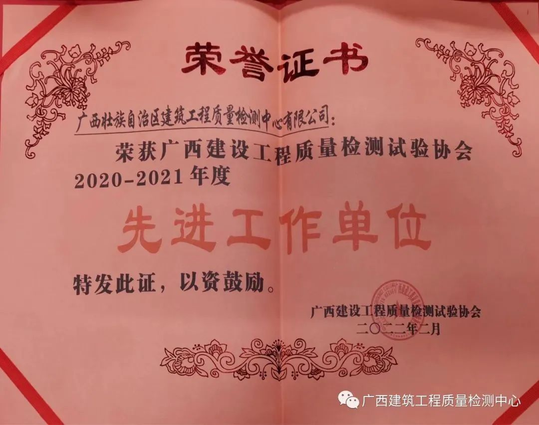 喜讯!检测中心获广西建设工程质量检测试验协会2020-2021年度先进...